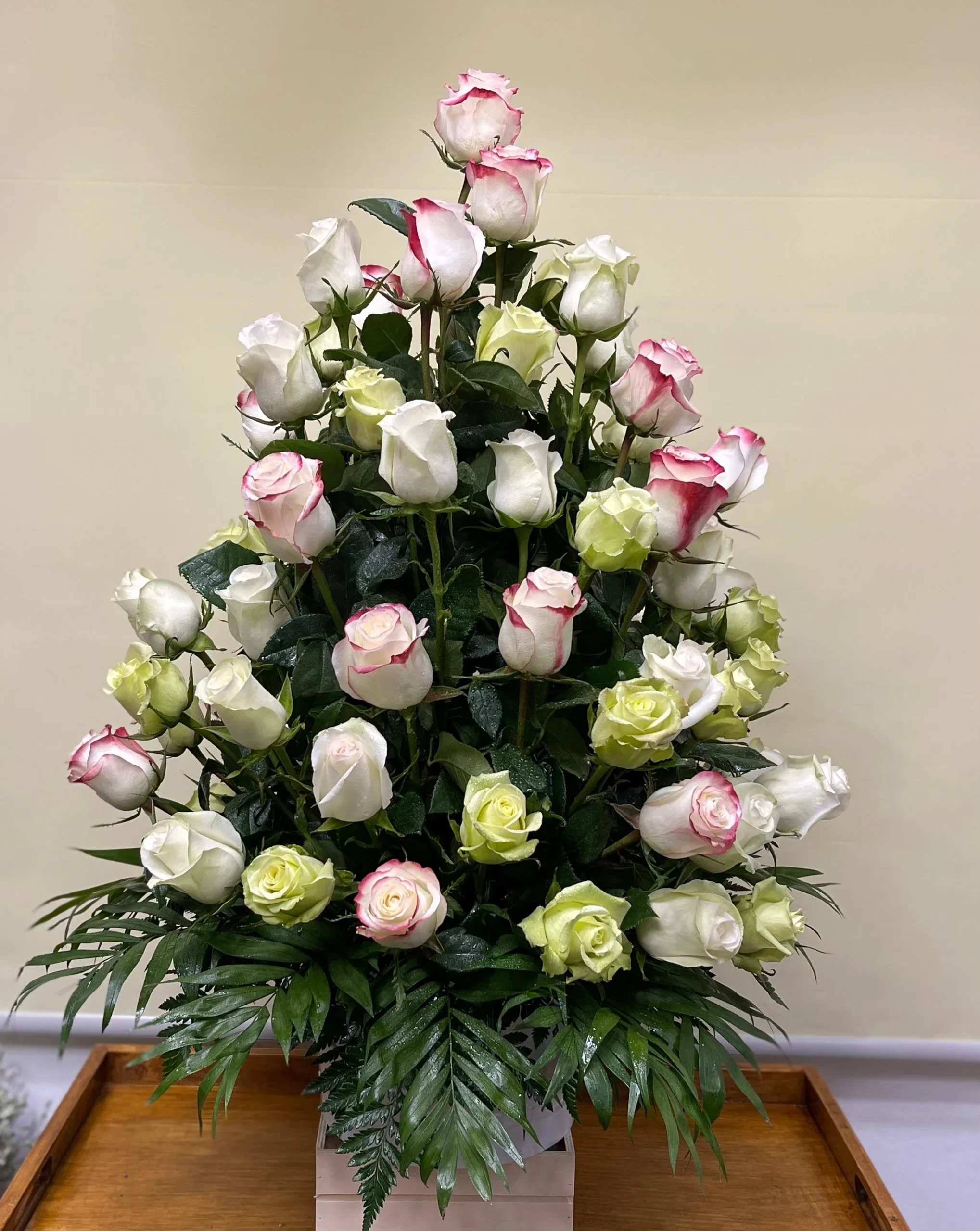 Aquest arranjament floral amb 60 roses està disponible amb enviament a domicili a Andorra. És una composició delicada i equilibrada, formada per roses blanques, grogues suaus i roses amb puntes rosades, disposades en forma cònica dins d’un gerro blanc rectangular. Les flors més altes ocupen el centre, mentre que les més curtes envolten la base, creant una estructura simètrica i visualment harmoniosa.