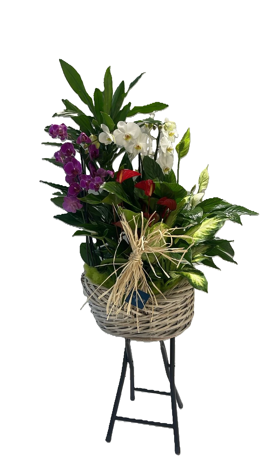 L’arranjament de plantes en cistell de vímet és una composició viva i equilibrada, formada per plantes verdes seleccionades per la seva resistència, textura i harmonia visual. Presentades en un cistell de vímet natural, aquestes plantes evoquen calma, connexió amb la natura i elegància rústica.