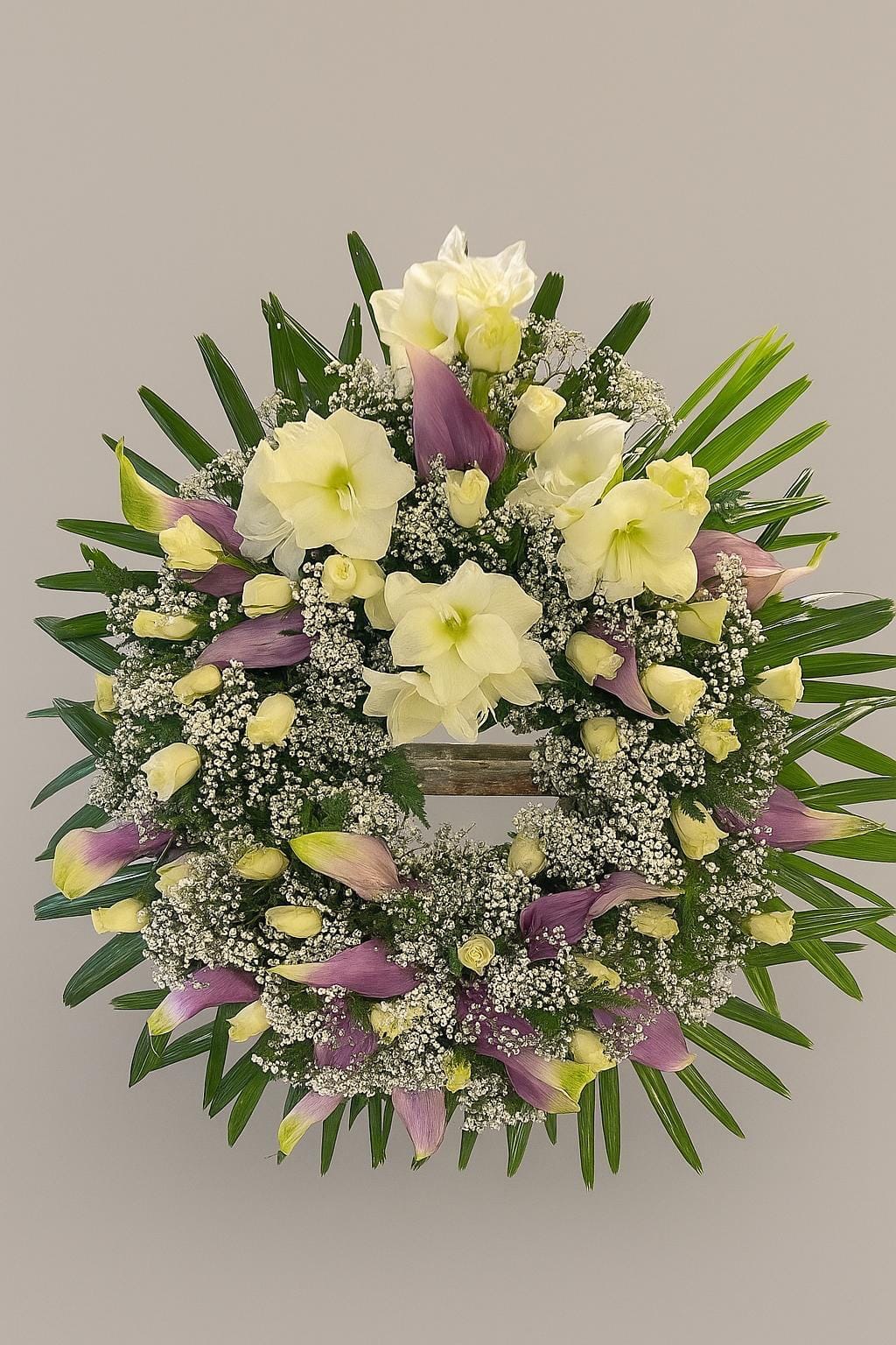 Corona Amarylis i Anthurium és una composició floral circular pensada per expressar afecte, serenitat i respecte en el comiat. Amb flors en tons rosats suaus, crema i verds ornamentals, aquesta corona evoca una emoció càlida i elegant.
