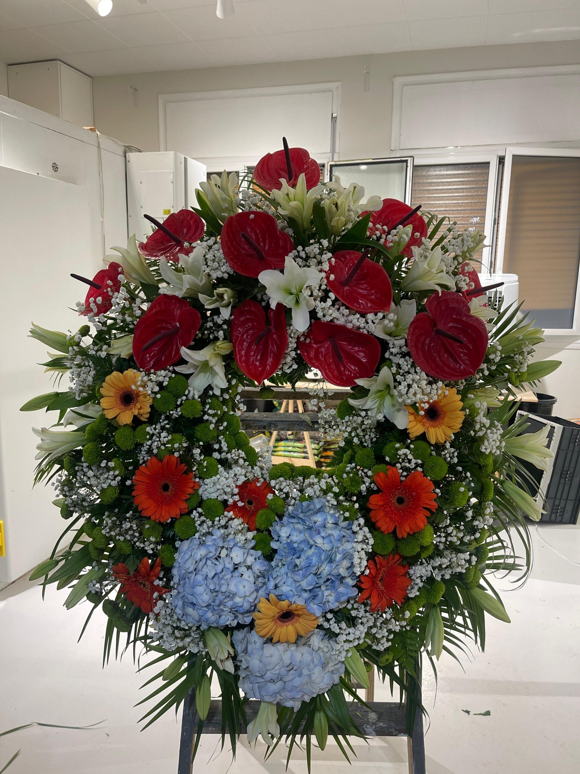 Corona Anthurium i Hortensias és una composició floral circular que simbolitza el pas cap al record amb serenitat i esperança. Pensada per a cerimònies de comiat, aquesta corona acompanya el dol amb una presència càlida, vital i plena de significat.