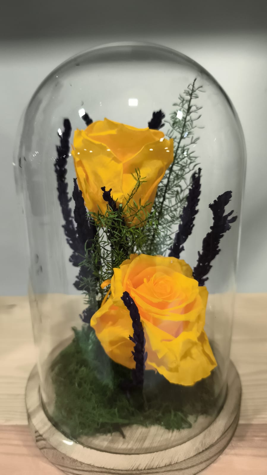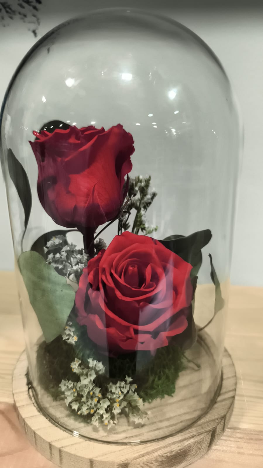 La Cúpula amb Dues Roses Eternes és una peça decorativa d’alta qualitat que combina natura preservada i disseny acollidor. Dues roses vermelles, seleccionades i tractades mitjançant un procés de preservació, es presenten dins d’una cúpula de vidre transparent amb base de fusta natural.